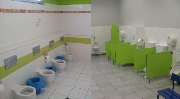 Mais le plus choquant, pour moi, n’ayant pas vu ça depuis des années, ont bien entendu été les toilettes. Et oui. Les fameuses toilettes des écoles maternelles. Pendant que mon filleul urinait les fesses à l’air dans son urinoir à lui, j’ai pu prêter attention au reste de la pièce. Car non seulement, tout y est minuscule, mais tout y est surtout ouvert. Je vous ai fait une reconstitution à partir d’images Google pour vous faire une idée (On ne voit pas les urinoirs mais en vrai si, y’en a. Parce que faire pipi debout comme les grands, c’est cool et tu te la pètes !).